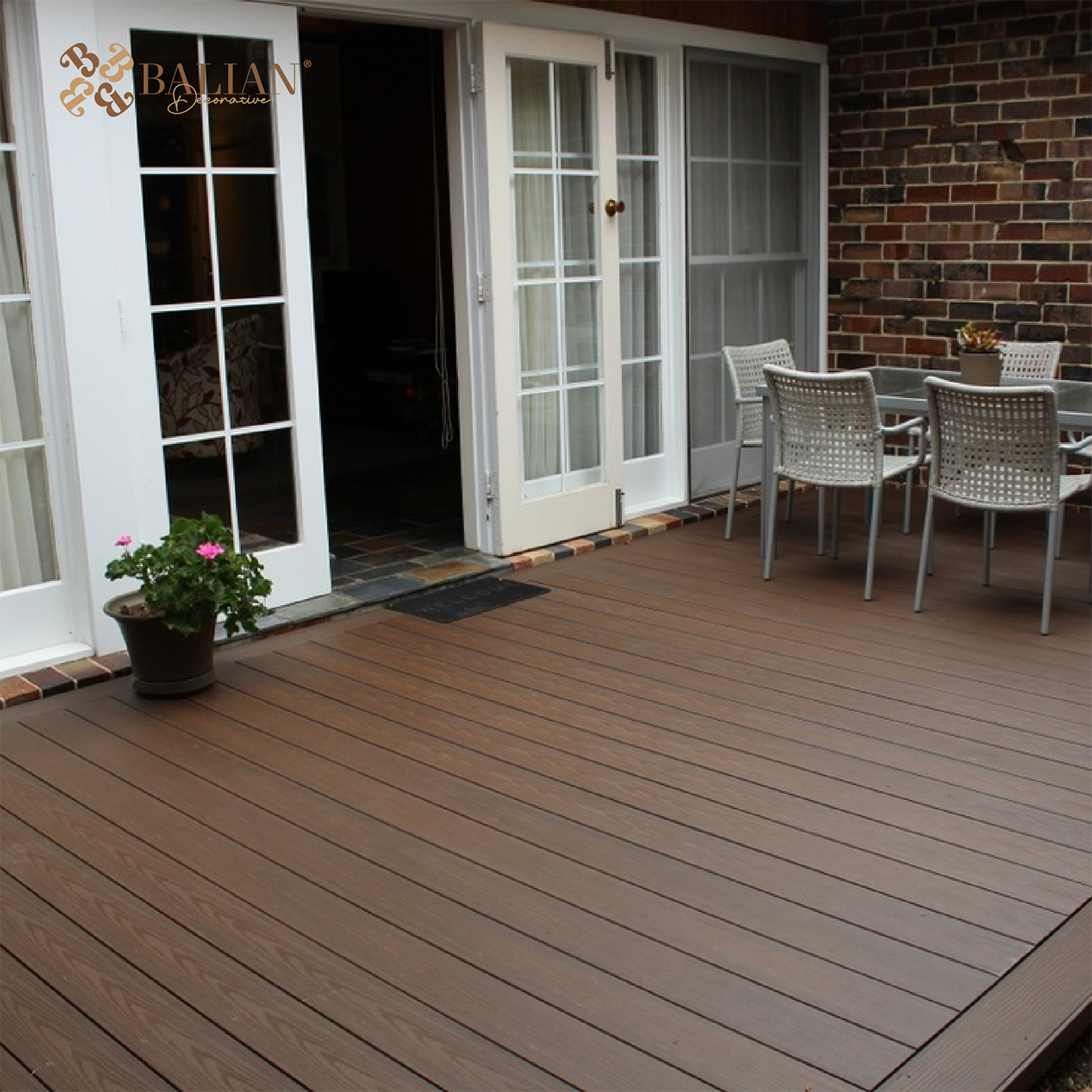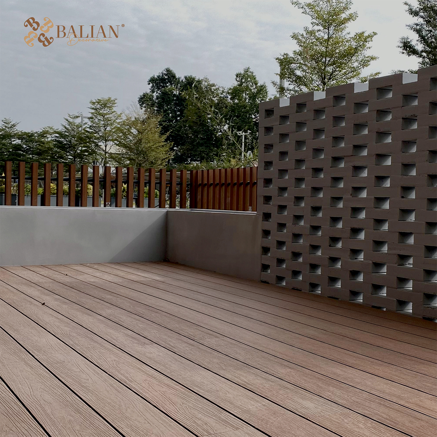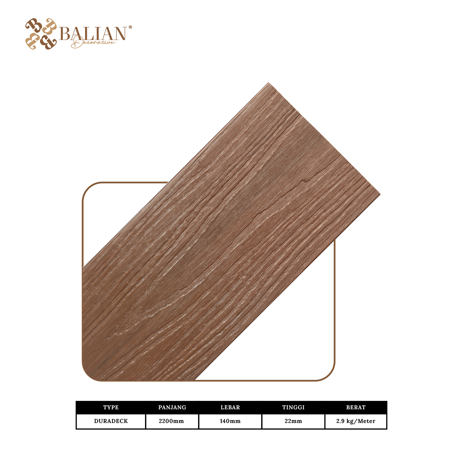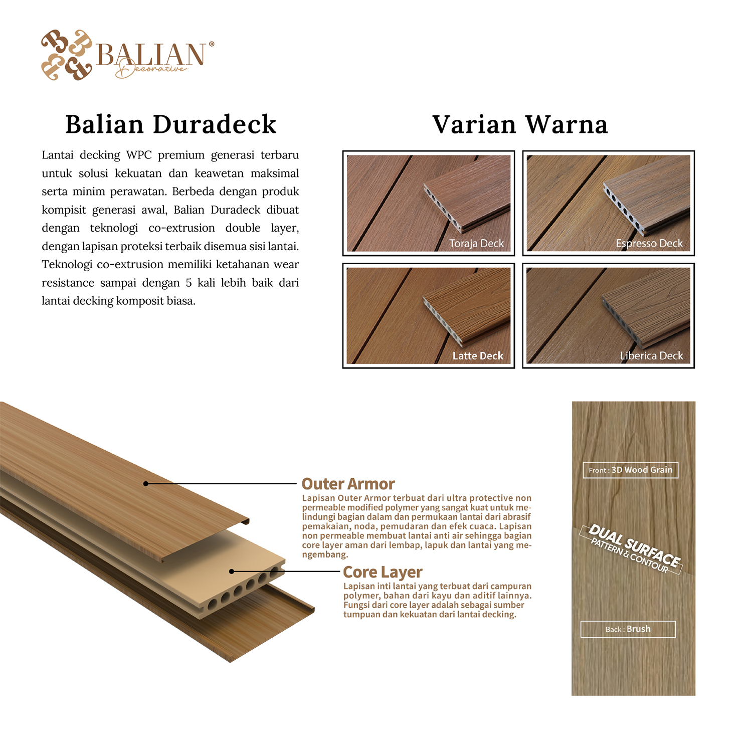 Lantai decking WPC premium generasi terbaru untuk solusi kekuatan dan keawetan maksimal serta minimum perawatan. Berbeda dengan produk komposit generasi awal, Balian Duradeck dibuat dengN teknologI co-extrusion double layer, dengan lapisan proteksi terbaik di semua sisi lantai. Teknologi co-extrusion ini juga memiliki ketahanan wear resistance sampai dengan 5 kali lebih baik dari lantai decking komposit biasa.